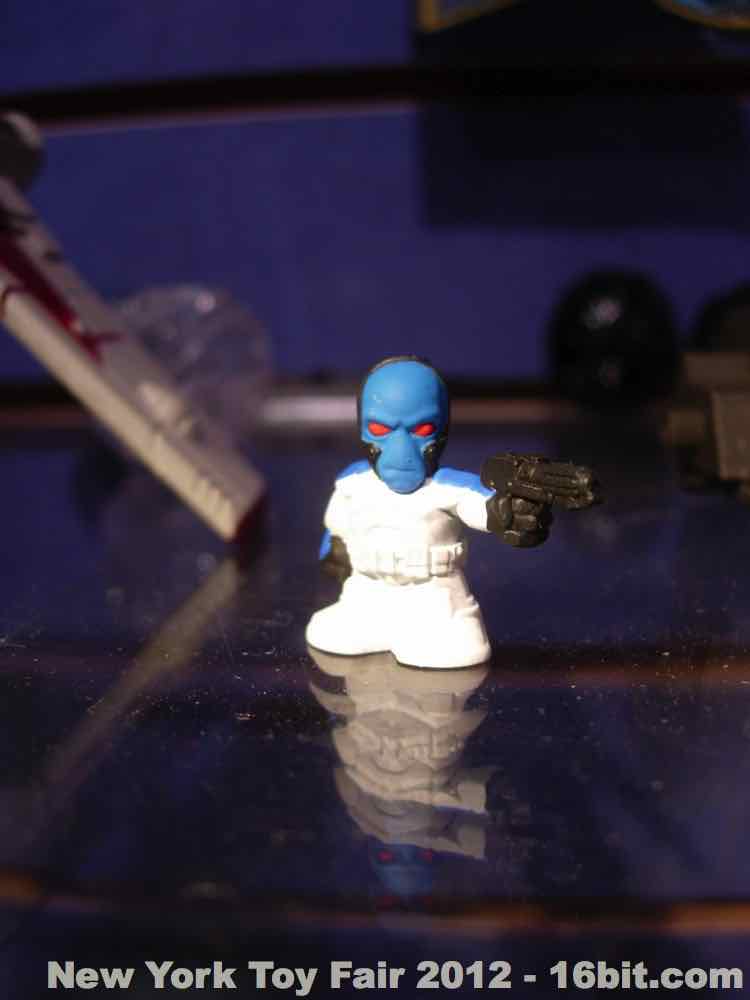 The other new item is in stores already, and it's Star Wars Fighter Pods. There are 48 out now, and they're basically Squinkies. Each soft rubbery plastic figure is under half an inch high, give or take, and spans all the movies-- but mostly the Original Trilogy. Some key characters are underrepresented, while others have an abundant number of releases-- there are three Chewbaccas, and zero Leias. There's a Porkins, but no Count Dooku. Heck, other than Stormtroopers there are very few villains of any kind, with dew other than Jango from the prequels. It's a neat collectible line, and Hasbro has plans for over 100 figures already. Small vehicles are out as well, and while the demonstrator indicating there would be a game component, that's sort of not exactly accurate. You can knock down figures with other figures... that's the game.