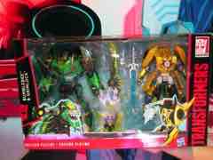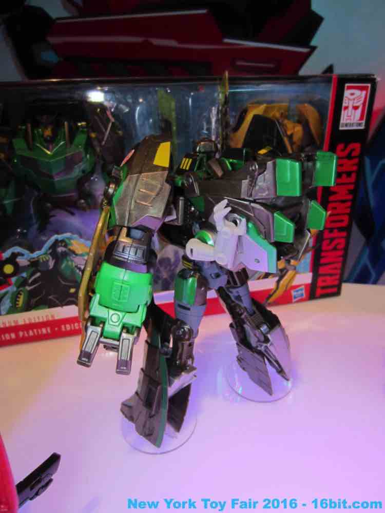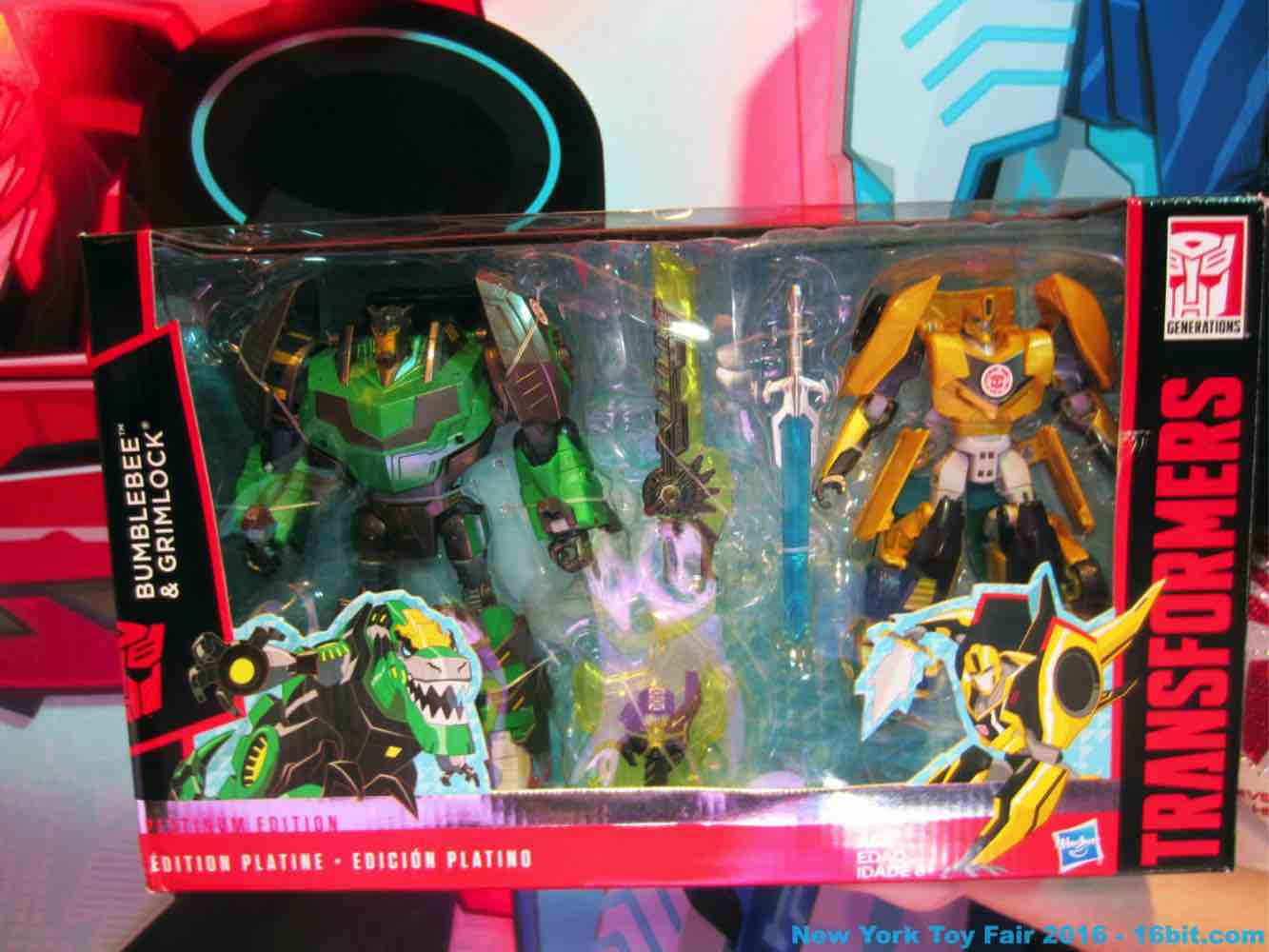 The Platinum Edition Bumblebee and Grimlock was confirmed to be exclusive to retailer (and employer) Entertainment Earth. The set was created in response to the lack of traditional Voyager-class toys early on with this line, with Grimlock being retooled from War for Cybertron Grimlock and Bumblebee has a nifty sword. Grimlock has exclusive deco and the mold is exclusive to this set in the USA, while Bumblebee has a metallic yellow finish and, in person, looks great.